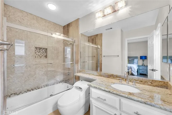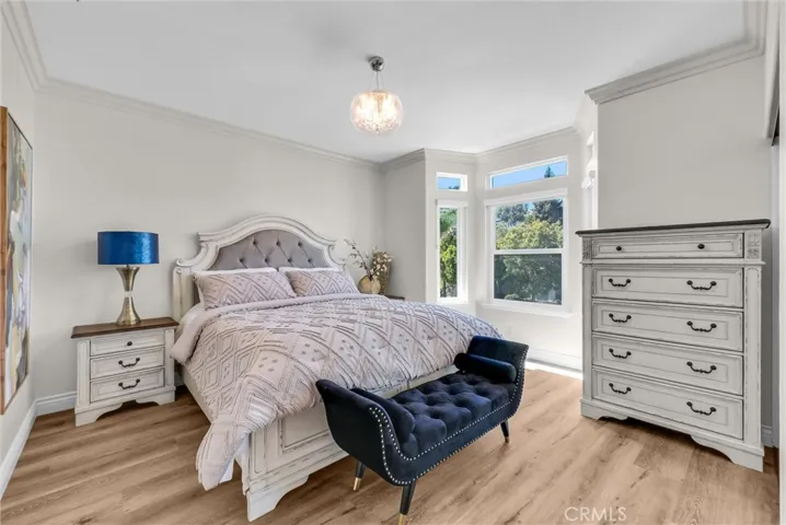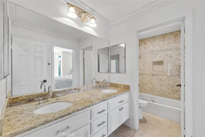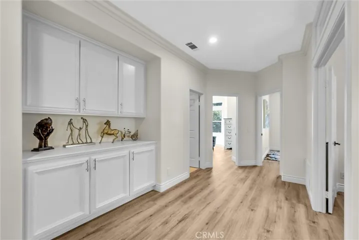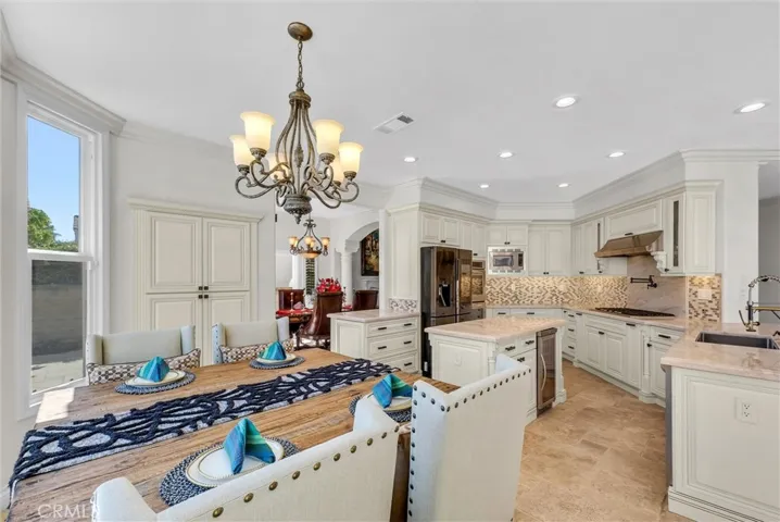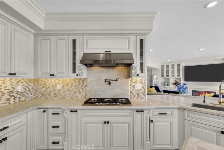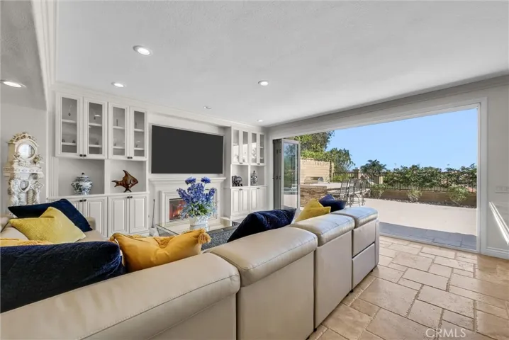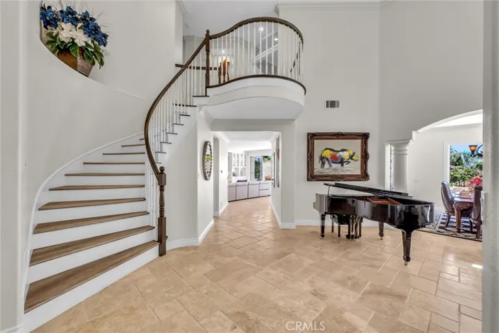 Welcome to 25672 Raintree, a beautifully and completely remodeled 5-bedroom/4.5-bathroom residence tucked away on a quiet cul-de-sac in the highly sought after Moulton Ranch community of Laguna Hills. From its elevated position, the home reveals stunning city light views at night and panoramic valley and mountain vistas by day. This home flourishes with luxury upgrades throughout. A grand entry with 8’ wood doors is framed by a gently curved staircase and features Versailles pattern travertine floors that flow through the first level and out to the patio. The living room’s fireplace is complemented by a wall of windows, while the dining room’s new French doors open to the soothing sound of a patio fountain. The open concept casual living area showcases a custom media wall and new bi fold doors that seamlessly blend indoor and outdoor living. The kitchen has been transformed with quartzite countertops, a stone backsplash inset with copper, and a Samsung smart tech refrigerator. The expansive primary suite offers tray ceilings, a pass-through fireplace, a sitting area, and a spa inspired bath featuring a designer smart toilet, dual shower heads, rain shower, and steam feature. All bathrooms throughout the home have been upgraded with limestone showers, new fixtures, premium finishes and smart toilets. Each bedroom enjoys its own bath, and a first-floor bed/bath is ideal for guests or maid quarters. Two dedicated offices provide ample workspace. The hilltop backyard is an entertainer’s dream, complete with a fully remodeled bar, BBQ area, and spa. Additional upgrades include new crown molding and baseboards, updated door and cabinet hardware, premium pad vinyl flooring upstairs, whole house re-piping with lifetime warranty, dual paned windows (front and back), fresh interior paint, LED lighting, and new front yard landscaping. This exceptional home offers convenient access to major freeways and is minutes from top rated schools, shopping, dining, and world class beaches. A neighborhood community park is just a short walk away.