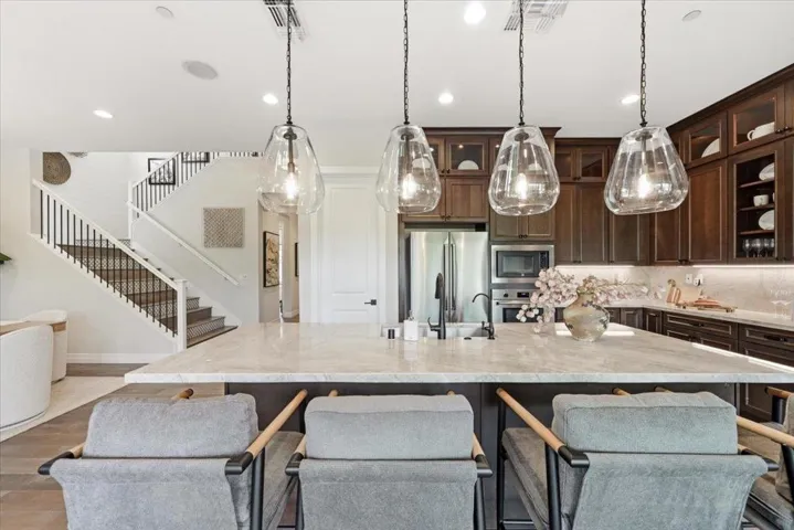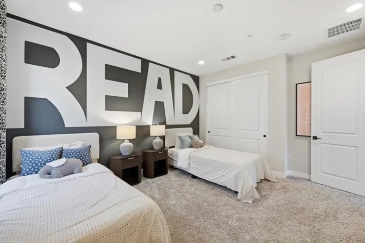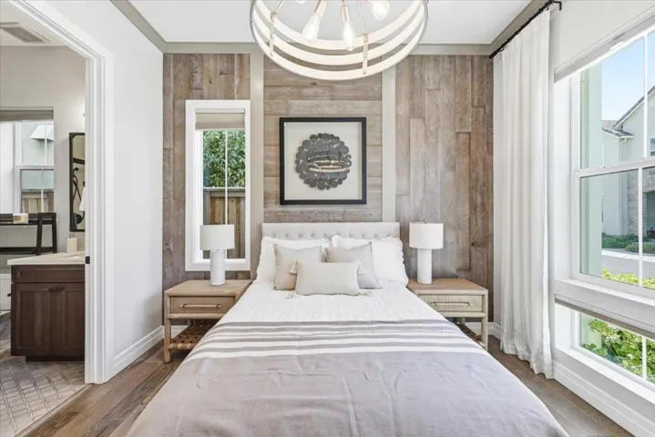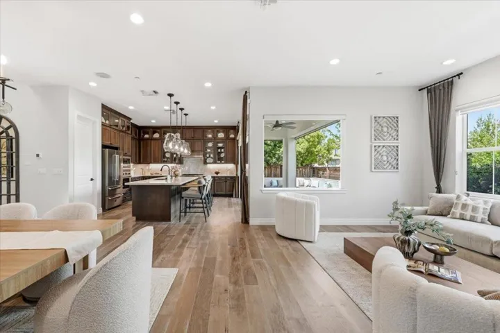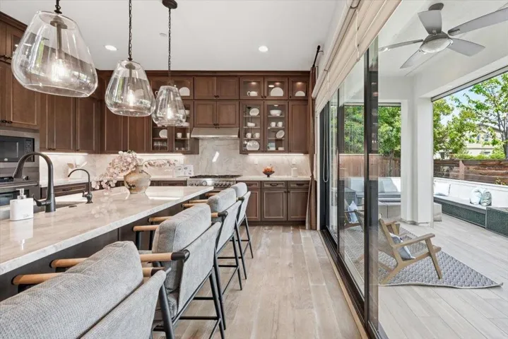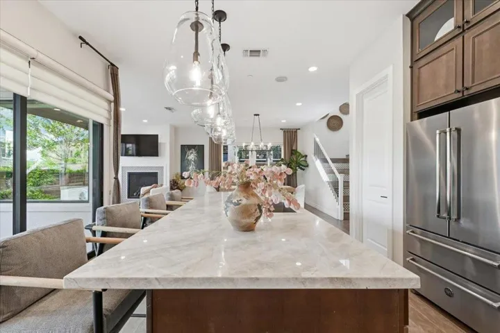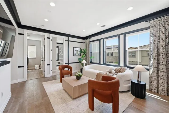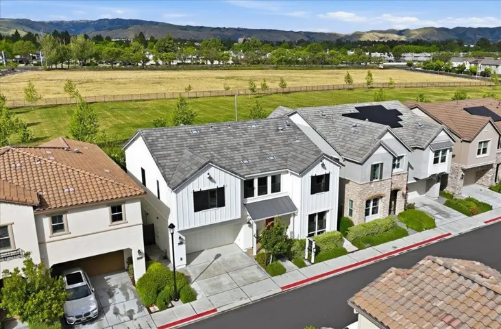 Rare opportunity to own a Sanctuary Village model home with exceptional floor plan and premium high-end finishes!!! Perfectly situated overlooking a 3-acre park with total rear privacy, this 5B/3.5B Landsea masterpiece features over $450K in designer upgrades and owner’s improvements. Soaring 10-ft ceilings and hardwood floors open to a dramatic open-concept space where the dining room, great room and fireplace flow together effortlessly. Featuring premium Bertazzoni appliances, quartzite countertops, and a matching backsplash, the gourmet kitchen faces the backyard through glass doors with serene park views. One ground floor bedroom with private en-suite bath is a thoughtful touch for guests or extended family. The second level showcases a generous loft and a lavish primary retreat complete with soaking tub, dual vanities and walk-in closet. The rare-find finished 3-car garage doubles as an entertainment lounge with kitchenette wet bar, wall-mounted TVs and electric mesh screen opening to a landscaped patio with fire pit and built-in seating. Custom Hunter Douglas blinds, California Closets storage, fresh exterior paint and phantom motorized screens complete this showpiece. Minutes to Costco, dining, Hwy 84, I-880, and major tech hubs including Tesla and Meta.