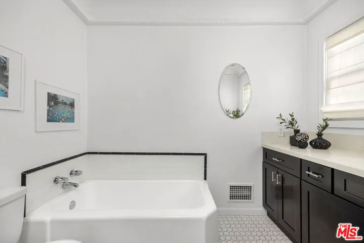 Step into a world of timeless elegance at 1663 S Genesee Avenue, an alluring 3-bedroom, 2-bathroom Spanish-style residence that perfectly balances historic character with modern sophistication. From the moment you arrive, the gated courtyard complete with a soothing fountain, vibrant Bougainvillea, and mature palms sets a tone of serene privacy. Spanning 1,687 square feet on a generous 6,705 square foot lot, this home is a masterclass in architectural detail. The light-filled interior welcomes you with original refinished hardwood floors and a step-down living room featuring a classic fireplace and ornate plastered crown moldings. The spacious dining room flows seamlessly into an updated kitchen, which boasts dramatic barrel ceilings, recessed lighting, and high-end finishes. Beyond the interior lies a picturesque backyard oasis, featuring mature olive trees, a lush lawn, and a covered grilling station, ideal for hosting al fresco gatherings in the temperate L.A. climate.