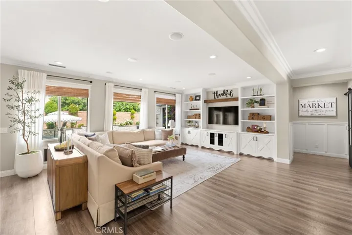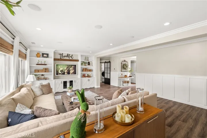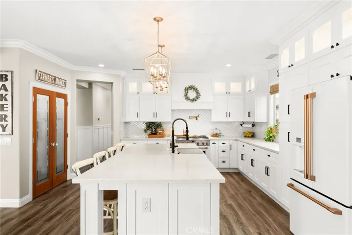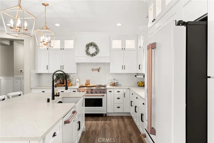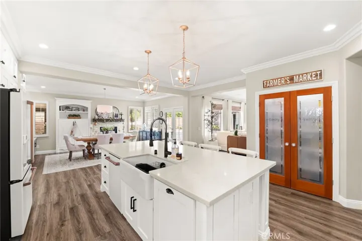 The remodeled kitchen serves as the centerpiece, showcasing custom cabinetry, quartz countertops, designer lighting, and an oversized island that opens directly to the main living and dining areas—ideal for both entertaining and daily living.