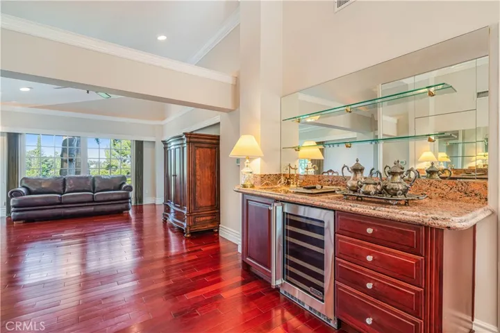 The gourmet kitchen is thoughtfully designed with granite countertops, custom cabinetry, Viking appliances, and a Sub-Zero refrigerator—perfectly positioned adjacent to the formal dining room and expansive living area, creating an ideal setting for both everyday living and entertaining.