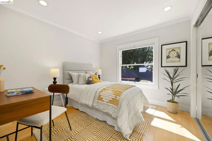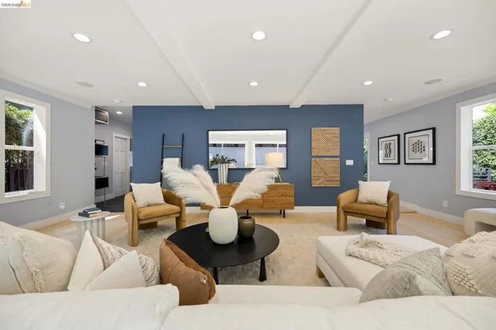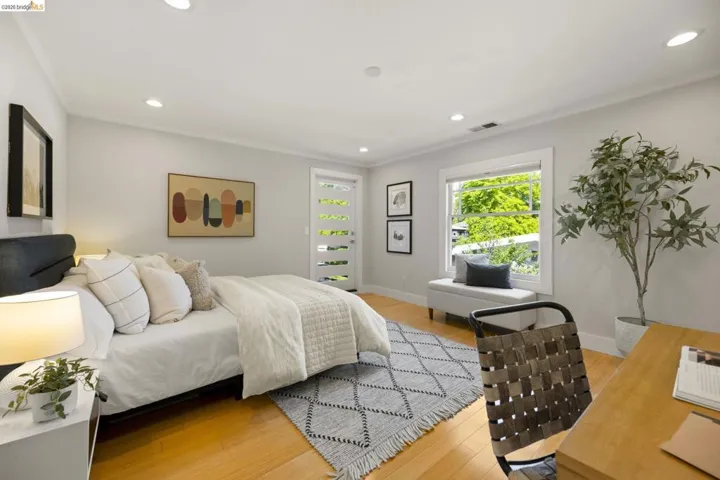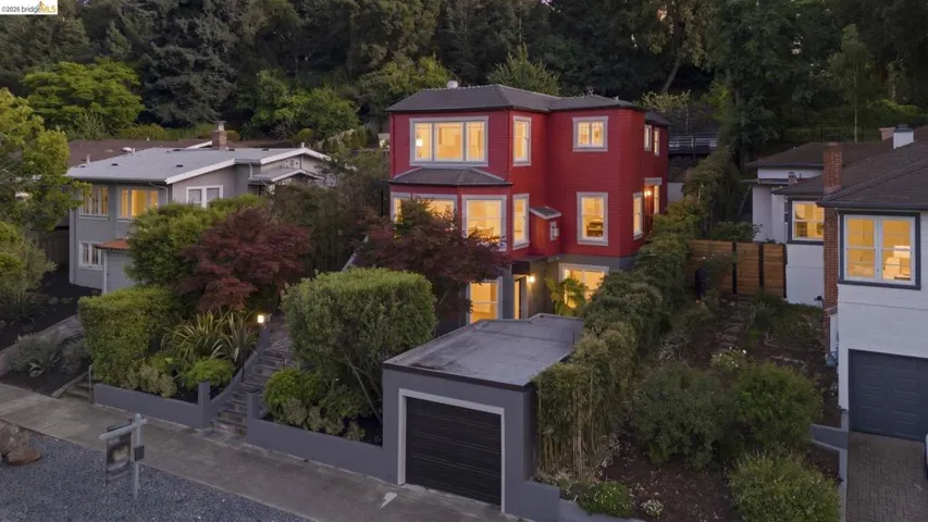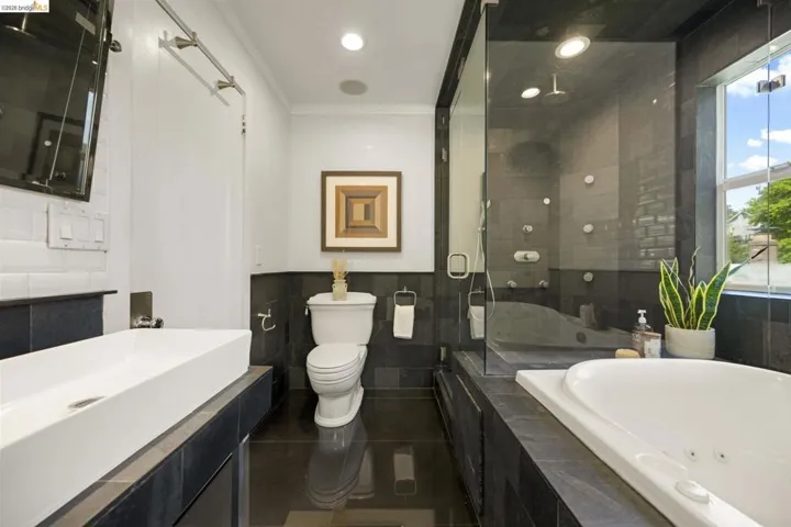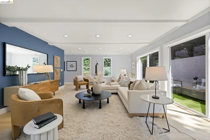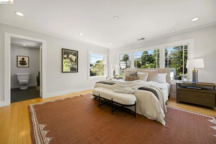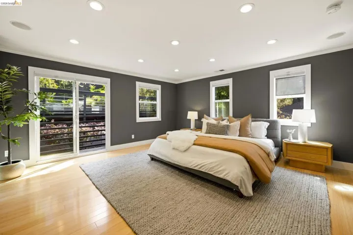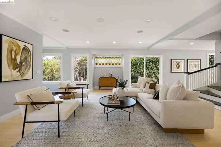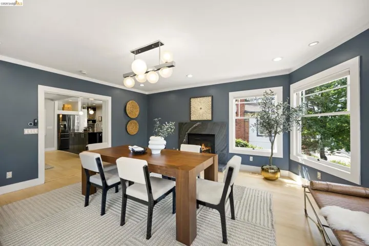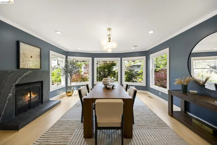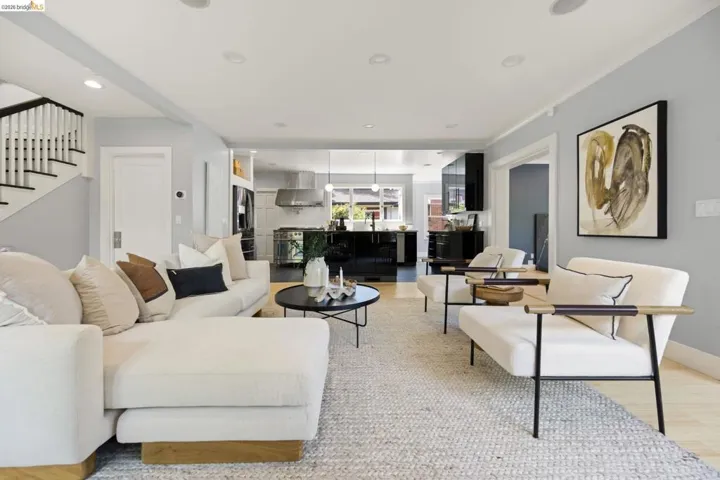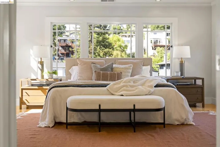 Contemporary Farmhouse Reimagined in the Heart of Crocker Highlands. Perched above the street, this rebuilt contemporary farmhouse blends classic character w/ modern design & thoughtful updates throughout. Expanded & re-engineered for enhanced flow & functionality, the home features light-filled interiors w/ an open great room connecting to a chef’s kitchen w/ high-end appliances, dual sinks, large island & ample storage—ideal for daily living & entertaining. Formal dining w/ bay windows & fireplace adds warmth & architectural presence. A rear living room opens to a level patio w/ hot tub & turf for seamless indoor-outdoor living, while an expansive upper-level view deck offers sweeping neighborhood views. Upstairs offers 4 bedrooms, including a spacious primary suite w/ balcony, a walk-in closet & spa-like bath, plus a second en suite & a full hall bath. Lower level includes a 5th bedroom or office w/ full bath & private entrance. Additional features include a 1-car garage w/ EV charger, solar, Tesla Powerwall, new roof & whole-house water filtration. Near award-winning Crocker Highlands Elementary, Lakeshore Ave shops, dining, Lake Merritt & easy Bay Bridge access.
