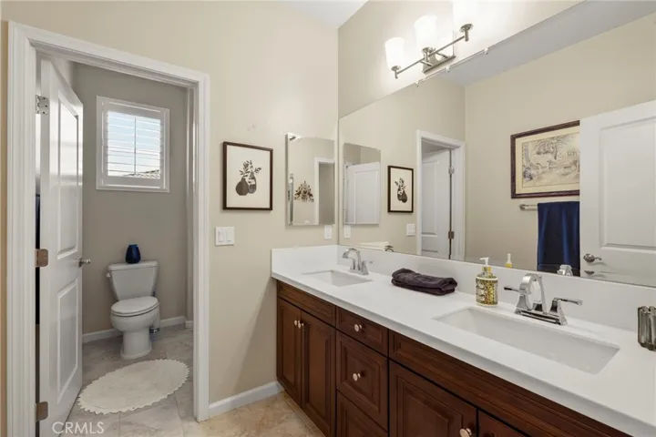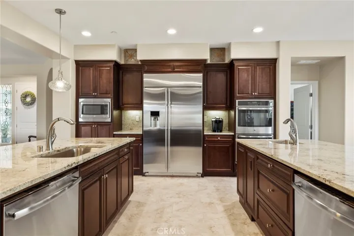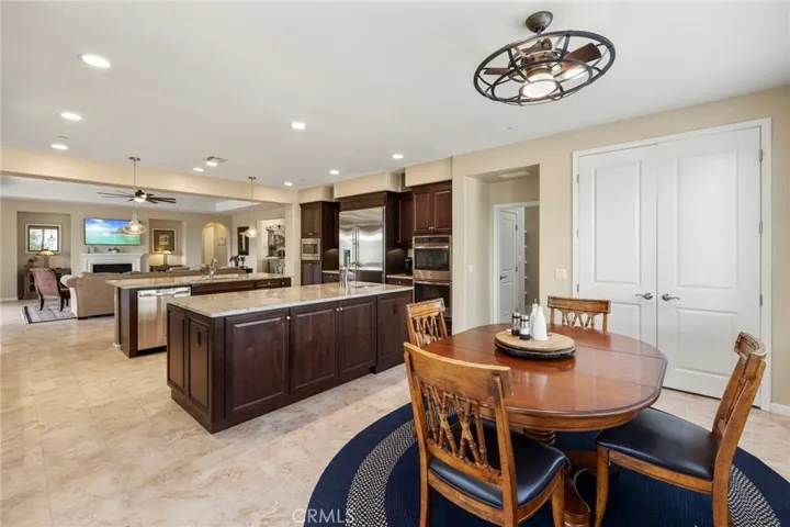 Designed for both comfort and entertaining, the home includes a formal dining room, a spacious and elegant living room, and a welcoming family room with a warm fireplace. The chef’s kitchen is truly the heart of the home, showcasing dual islands, two dishwashers, upgraded stainless steel appliances, and a double convection oven—ideal for hosting gatherings. Energy-efficient LED recessed lighting, remote blackout shades, and custom plantation shutters enhance the refined ambiance throughout.