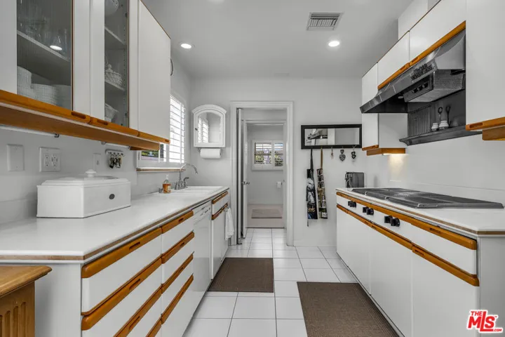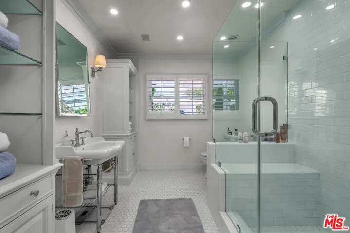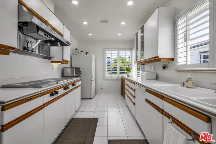 This two bedroom two bath beauty is flooded with light and offers perfect indoor/outdoor living. The spacious living room, overlooking the front yard, has a fireplace and white oak floors. Matching white oak flooring flows throughout, leading to a generous dining room and open den, ideal for large dinner parties! Both spa-inspired bathrooms have been tastefully remodeled with Perrin & Rowe fixtures and elegant Italian porcelain tile. One features a luxurious soaking spa tub, while the other offers an oversized shower with built-in seating. The kitchen features a six burner gas cooktop and ample storage. Additional highlights include central air conditioning and built-in Bose speakers.Step outside the den into a serene backyard oasis with a brick patio, sparkling swimmer’s pool, and tranquil fountain ideal for relaxing or hosting guests. The garage, enhanced with French doors, has been transformed into a versatile bonus space, complete with a laundry area and extra storage. Situated in a prime central Westside location, this home is just moments from popular dining, Trader Joe’s, The Expo Line, major freeways, UCLA, and Century City. Located within the sought-after Clover Avenue School District, this is a rare opportunity not to be missed!