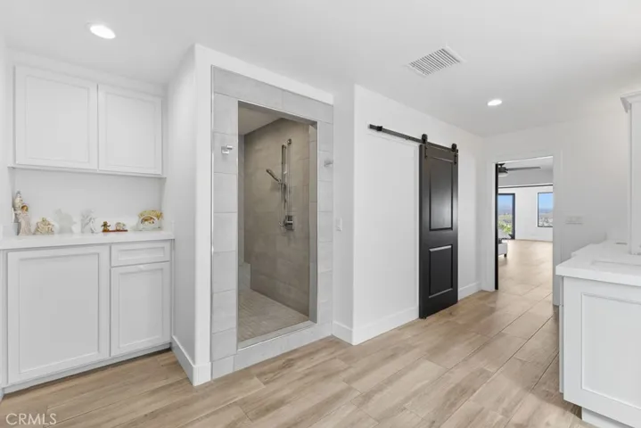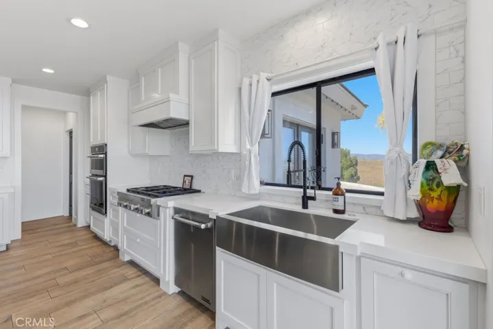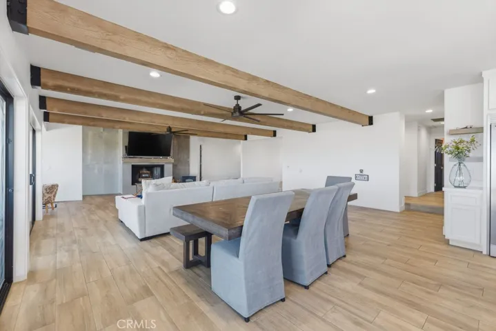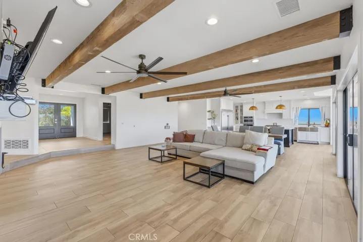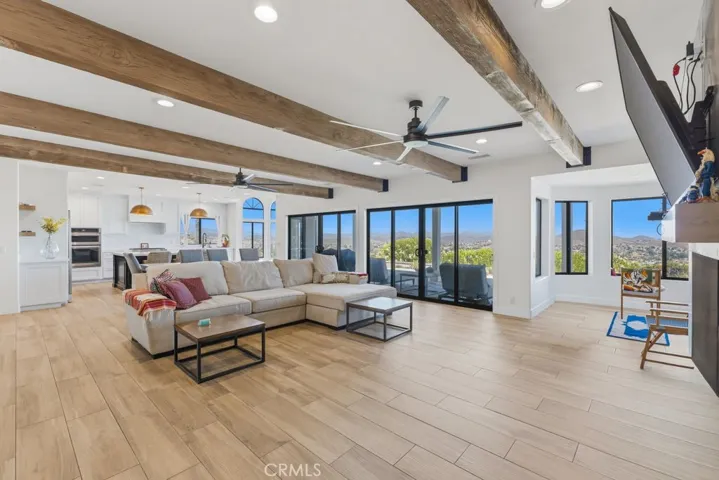 This stunning upgraded estate showcases a wide-open floor plan with soaring beamed ceilings, walls of windows, and glass doors that flood the home with natural light while framing spectacular panoramic views. The grand living and dining areas feature a striking stone fireplace and flow seamlessly into the heart of the home: a beautifully upgraded chef’s kitchen… Outfitted with premium Jenn Air appliances, including a double-wide built-in refrigerator/freezer, six-burner cooktop, quartz countertops, and a Calcutta Gold island, this space is designed for both everyday living and unforgettable gatherings. Custom cabinetry, abundant storage, and a spacious walk-in pantry complete the experience.