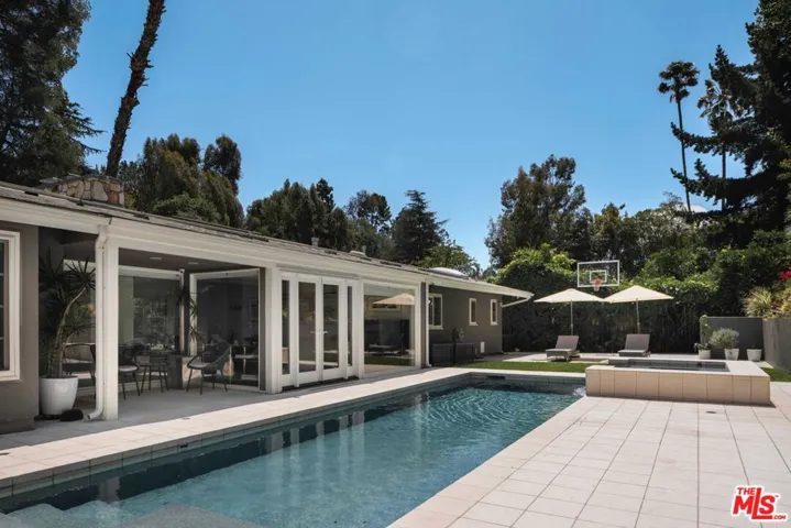 Thoughtfully reimagined Post and Beam in the coveted hills of upper Bel Air offering 3 bedrooms and 2.5 baths with soaring ceilings, skylights, and abundant natural light. The open floor plan unfolds from one space to the next, creating a seamless indoor-outdoor flow designed for both everyday living and effortless entertaining. The living room is anchored by a redesigned gas fireplace and opens through French doors to a private outdoor setting featuring a resurfaced saltwater pool and spa, drought-tolerant landscaping, and multiple areas for lounging and dining, allowing the home to transition easily between interior comfort and outdoor living. The kitchen is both beautifully finished and highly functional, appointed with custom cabinetry, quartz countertops and backsplash, and a premium suite of appliances including Wolf, Sub-Zero, induction cooktop, and steam oven, all connecting to the main living and dining areas. The primary suite offers a quiet and refined retreat with updated finishes including a new countertop, mirror, sconces, and towel warmer, while two additional bedrooms are well-proportioned and thoughtfully positioned with a jack and jill bathroom. A detached air-conditioned structure provides flexibility as an office, studio, or creative space, complemented by a two-car garage with air conditioning and built-in storage suitable for gym or flex use. Recent upgrades include new HVAC and ductwork, water softener, tankless water heater, upgraded electrical, backup generator, new gutters, and new pedestrian side gates. Smart home features include lighting, motorized blinds, pool and spa controls, irrigation with rain sensors, and security cameras, all accessible remotely. Additional features include EV charger and fruit trees including apple, fig, lemon, and lime with passion fruit vines. Located within the Roscomare Road Elementary School district and just moments from Bel Air amenities.