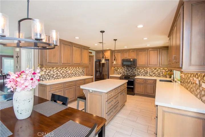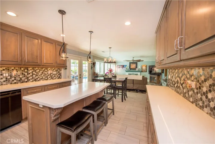 The gourmet kitchen has been beautifully remodeled to inspire, featuring custom wood cabinetry with designer hardware, pendant lights, quartz countertops, and a stylish backsplash.