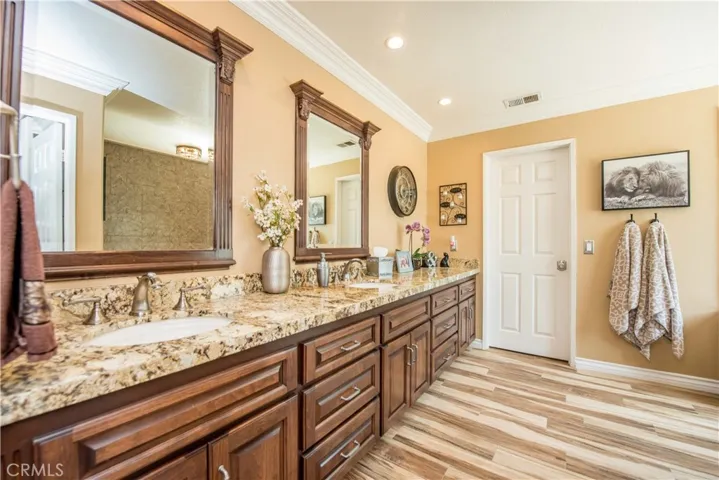 Retreat to the primary suite, a private sanctuary designed for relaxation, complete with a spacious walk-in closet and a completely remodeled en suite bathroom showcasing custom walk in shower, dual vanities with granite counter tops, and refined finishes.