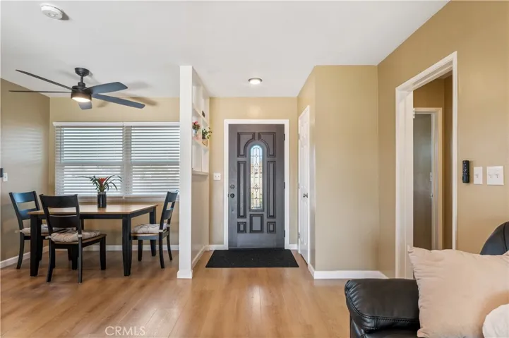 Located in the highly sought-after Hollypark neighborhood of Gardena, this well-maintained 3-bedroom, 2-bath home sits on a spacious corner lot and is filled with natural light throughout. A welcoming front porch leads into the generous main living area, where sliding glass doors open to the backyard, creating an easy indoor-outdoor flow. Recessed lighting and beautiful laminate flooring add a fresh, modern touch. Just off the living room, the dining area is perfectly positioned for everyday meals and effortless entertaining. The kitchen features warm wood cabinetry, granite countertops, and tile flooring, while a separate laundry room offers added convenience and extra storage. The functional floor plan provides privacy and flexibility, with one bedroom located on one wing of the home and two additional bedrooms on the other. One bedroom includes an attached bath with a walk-in shower. Both bathrooms feature an updated vanity with quartz countertops. All bedrooms are equipped with ceiling fans and mini A/C units for added comfort during warmer months.