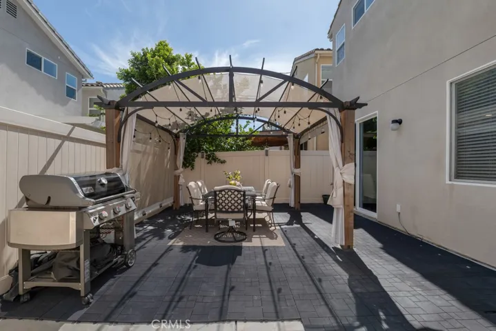 The kitchen features quartz countertops, stainless steel appliances, and a breakfast bar that opens to the dining area, perfect for everyday living and entertaining. Sliding doors lead to a private courtyard with a gazebo, ideal for outdoor dining and summer BBQs.