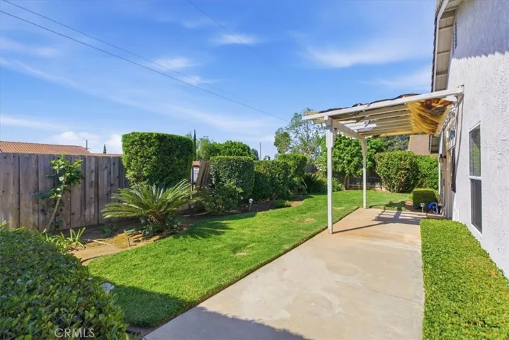 Outside, enjoy a manicured yard with automatic sprinklers, a covered patio for outdoor dining, and mature fruit trees, including orange and grapefruit. The landscaped front yard, brick veneer accents, tile roof, and roll-up garage door add to the home’s curb appeal.