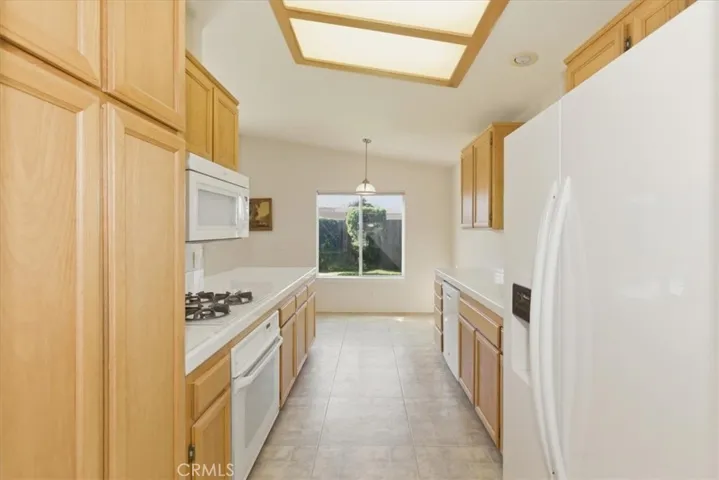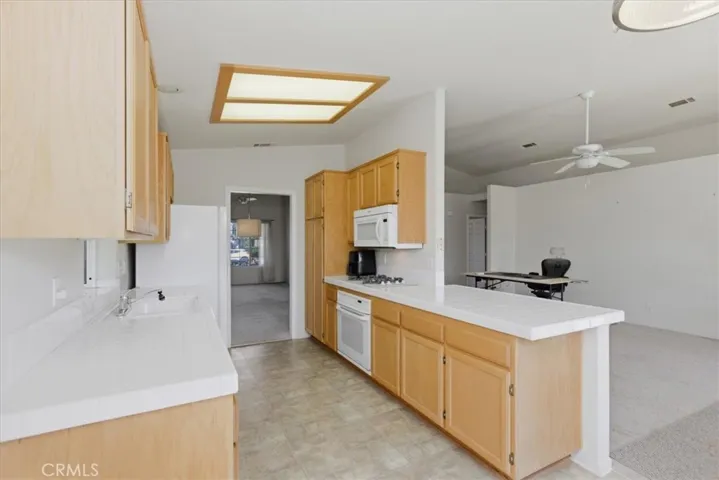 The kitchen features a gas cooktop, microwave, garden window, and a sunny dining area, all positioned to enjoy views of the beautifully maintained backyard. Dual-pane windows, ceiling fans throughout, and wide hallways enhance comfort and functionality.