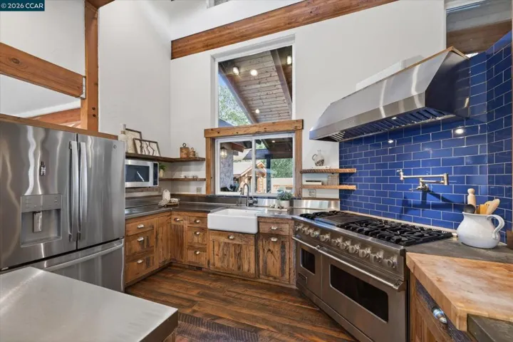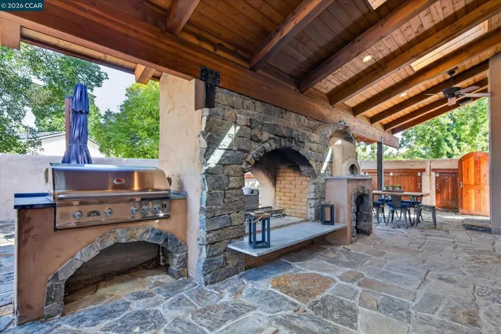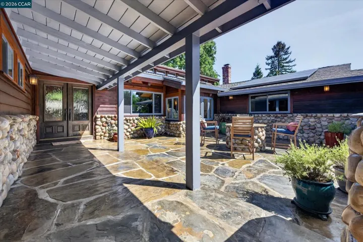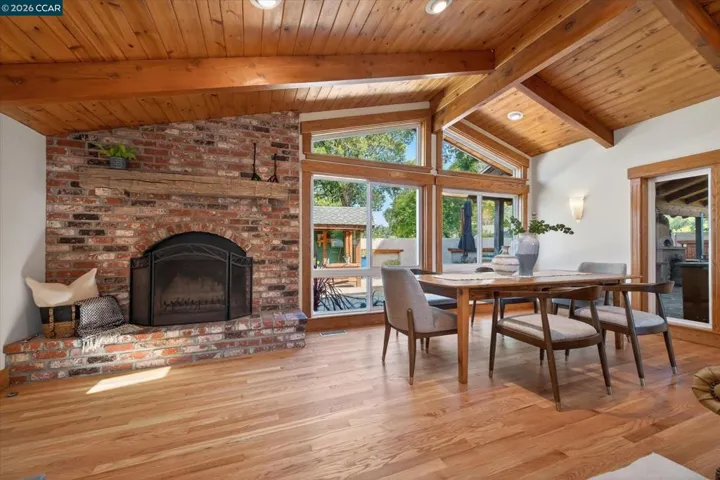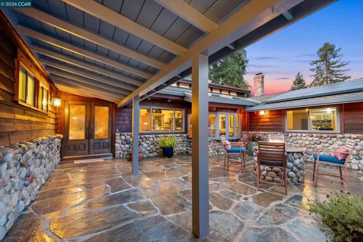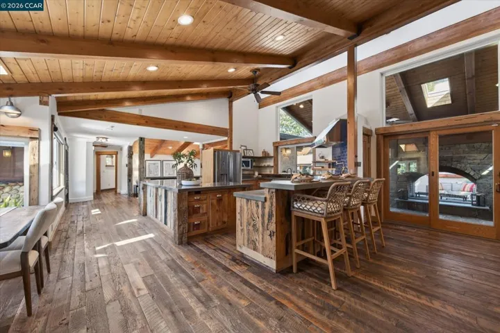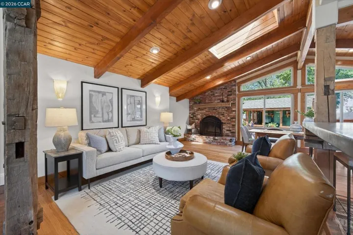NORTHGATE NEW TO MARKET! One-of-a-kind, Tahoe-inspired, 4 BR/3 BA single-story home, blends reclaimed materials, custom craftsmanship and extensive structural improvements for a warm, inviting aesthetic. Reclaimed/distressed wood flooring, complemented by timber posts, paneled walls and built-ins, create a rich, grounded interior. Exceptionally designed with entertaining in mind, the home features a private front courtyard with custom fire table – an ideal setting for gathering – before entering the interior’s open floor plan with vaulted ceiling. The well-planned kitchen features a farmhouse sink, deep blue tile backsplash, custom cabinetry, Viking range, and a mix of steel and concrete countertops. Living spaces are anchored by a massive stone fireplace, adding both scale and character. The backyard continues the experience with a covered outdoor living space featuring multiple seating areas, a custom outdoor fireplace, built-in BBQ and pizza oven. Conceptual plans to enclose the 400 sq ft space convey with the property, offering future expansion potential. The expanded primary suite features a fireplace, generous walk-in closet and an en suite bathroom with a large shower and jetted tub. A truly distinctive home offering character, warmth and a natural setting for entertaining. Close to top-rated Northgate schools, parks, trails, shopping and dining.