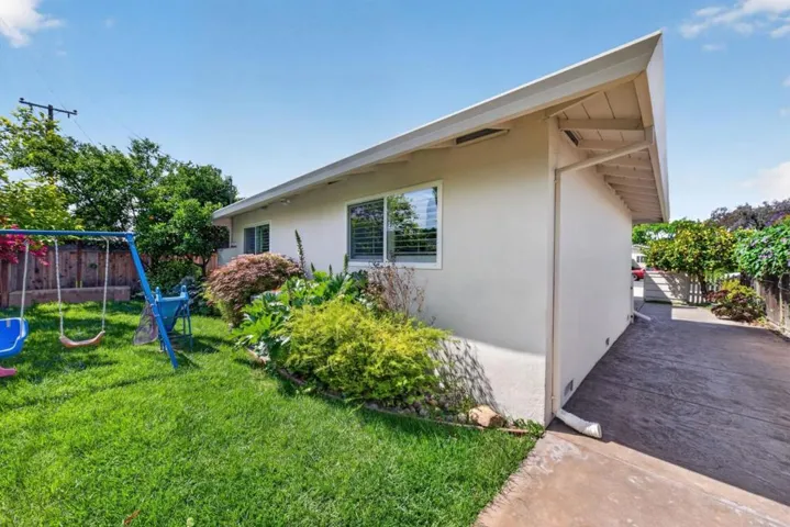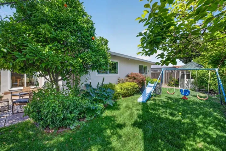 Intentional design and everyday comfort come together in a home that feels both welcoming and refined. At the entry, a mature citrus tree loaded with fruit adds character and a natural focal point, complemented by drought-conscious landscaping that balances beauty with easy upkeep. Inside, a large, thoughtfully arranged kitchen anchors the main living space, offering an island workspace, extensive storage, smooth countertops, and modern flooring, with an open orientation toward the rear yard that keeps indoor and outdoor living visually connected. Out back, the property transforms into a private outdoor setting with layered greenery, a dining patio, and distinct zones for gathering and recreation, while a shaded structure adds a quiet escape for reading or relaxation. The front grounds continue the low-maintenance theme with raised planting beds and climate-friendly landscaping, and dual gate access enhances security while supporting a pet-friendly environment. Throughout the interior, window coverings provide adjustable light and privacy in every room. Comfort is enhanced by central heating and air conditioning, generous garage storage, and a location offering convenient access to major employment hubs, shopping, and commuter routes.
