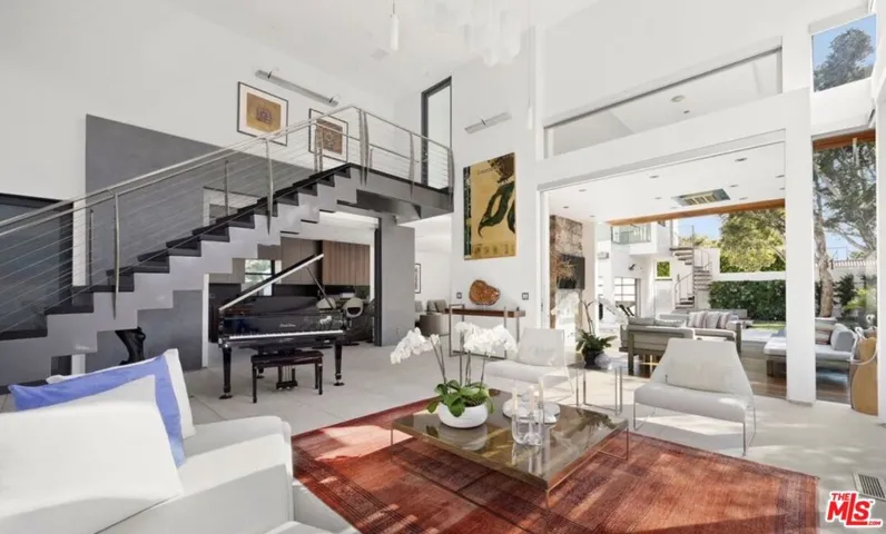 Located in the prestigious North of Montana neighborhood, this contemporary estate is privately set behind lush landscaping and mature trees, offering seamless indoor-outdoor California living. Floor-to-ceiling windows fill the formal living room with natural light, highlighting soaring double-height ceilings, exposed wood beams, a dramatic staircase, and a stylish wet bar. Pocket doors open effortlessly to the outdoor living area with fireplace, fire pit, and a striking black-bottom pool and spa.The formal dining room overlooks serene bamboo-lined grounds, while the Italian chef’s kitchen features a Wolf range, Miele warming drawer, waterfall island, and premium appliances. The adjoining family room offers direct outdoor access and a massive 115-inch screen for ultimate entertainment.The primary suite boasts a spa-inspired bathroom with steam shower, jetted tub, dual vanities, and a private office. A two-story converted garage provides flexible space for vehicles, recreation, gym, yoga, or creative studio.Outdoor amenities include a built-in BBQ, expansive patio areas, and a fire pit lounge ideal for entertaining. Located moments from Brentwood Country Club, Brentwood Country Mart, top dining, parks, shopping, and world-class beaches.