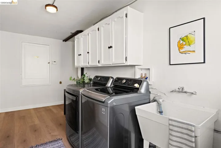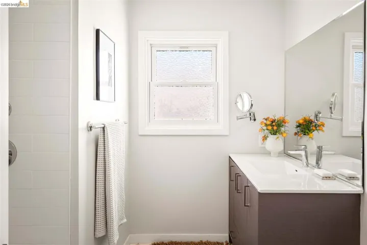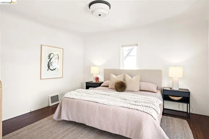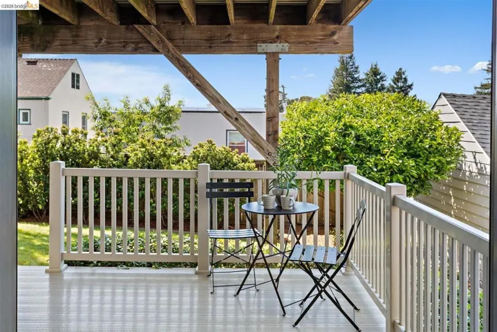 This updated 1936 Redwood Heights traditional brings charm galore and the kind of upgrades that let you actually enjoy it. Original character shows up everywhere, from the beamed ceilings in the living room to the vintage Pryne & Co Milko Box tucked into the breakfast nook. Two fireplaces, two western-facing decks, and afternoon sunshine that makes the living room glow. The updated galley kitchen is both sleek and practical, with deep drawers, roll-out shelves, stone counters, and a built-in water filtration system. French doors with built-in blinds open onto a large deck where the San Francisco skyline and the Mormon Temple sit right in your line of sight. Downstairs, the primary suite has its own fireplace and French doors to a private deck. A stairwell connects the upper deck to a grassy backyard full of mature perennials and an orange tree. Many big-ticket items have already been tackled: updated copper pipes (2022), electrical rewired with panel upgraded (2022 and 2026), new heat pump, AC, and ducting (2023), sewer lateral compliant, and owned solar. Garage with interior access and EV charger. Dual-pane windows, a laundry room, a coat closet, a wine storage closet, plus additional storage off the lower deck. Blocks to Redwood Heights Elementary, the Rec Center, Lincoln Square, and the Laurel district. More photos and a floor plan map coming soon!