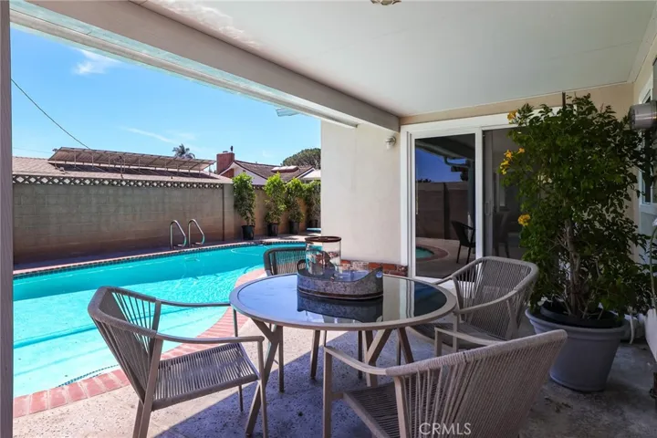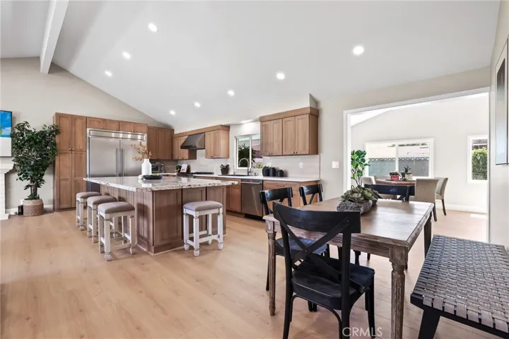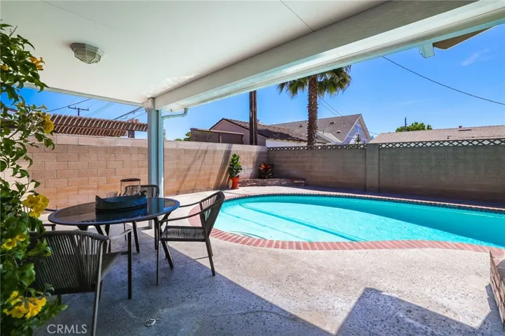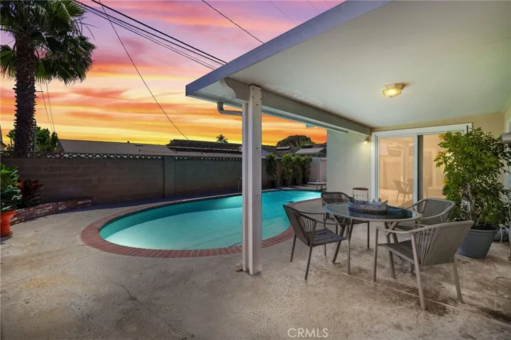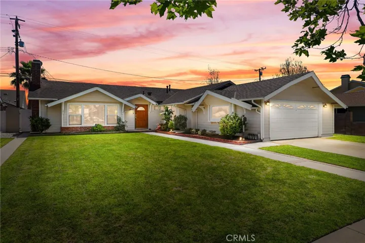 Nestled on a desirable tree-lined street, this beautifully updated Plymouth model offers exceptional curb appeal with an expansive front lawn and charming planters that create a warm and inviting first impression. This thoughtfully upgraded home features a 2-car attached garage and a recently remodeled open-concept kitchen designed for both everyday living and entertaining. The kitchen seamlessly flows into the living room with its stunning vaulted beam ceiling, creating a bright and airy great room feel. High-end finishes include quartz countertops, a large granite-topped island, and a full suite of stainless steel appliances. They are highlighted by an oversized side-by-side refrigerator/freezer, gas range with hood, dishwasher, and ice maker. The living room is anchored by a cozy fireplace with a full-length brick mantle, while a picturesque front window frames views of the lush front yard, filling the space with natural light. Offering four bedrooms, the flexible floorplan includes two guest bedrooms and a versatile office space (originally designed as an optional fourth bedroom), ideal for today’s work-from-home needs. The remodeled primary suite is a true retreat, featuring dual closets, a large window with a built-in window seat overlooking the front yard, and a beautifully updated en-suite bathroom that showcases a new frameless shower, dual sinks, updated mirror, and modern cabinetry. Step outside to a private backyard designed for both relaxation and entertaining, complete with a sparkling pool, two covered patios for year-round enjoyment, and a gas fire pit perfect for evening gatherings. A finished side yard offers additional functionality with a storage shed, providing ample space for organization and convenience.