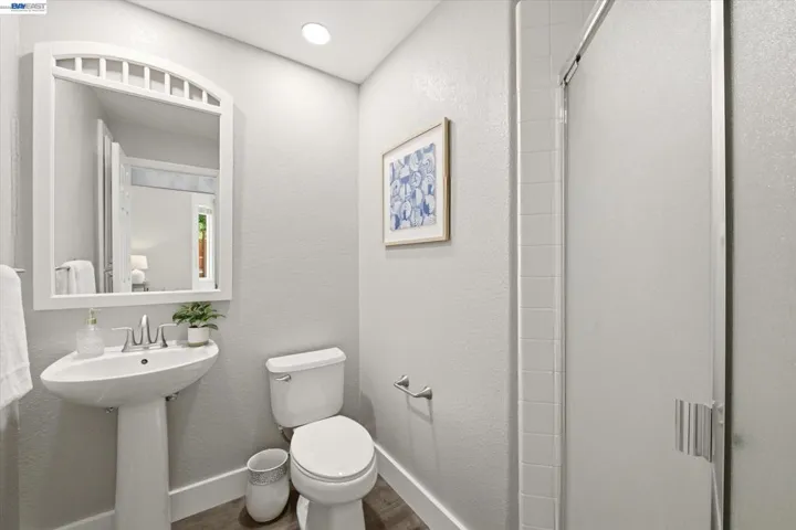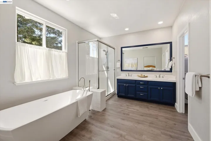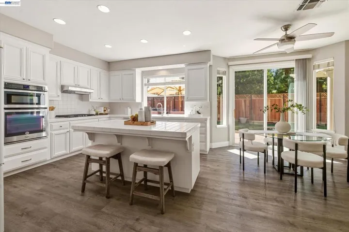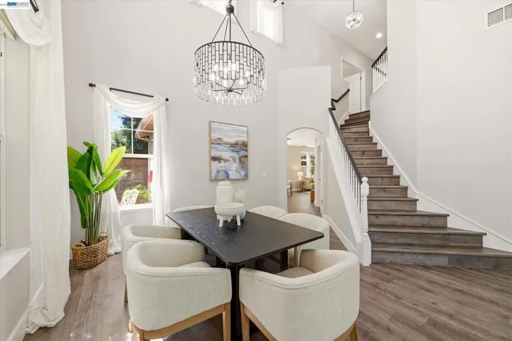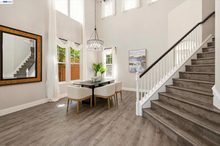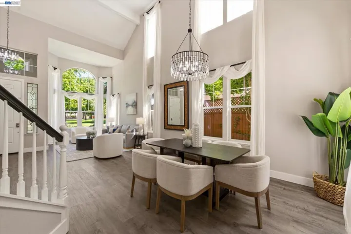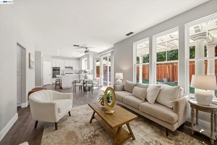 Fantastic east-facing four-bedroom, three-bath home situated directly across from the beautiful 6 acre Hansen Park and just a short walk to top-rated K–12 schools, downtown Pleasanton, and shopping. Enjoy easy commuter access to the 580/680 freeways. Inside, you’re greeted by abundant natural light, soaring 14-foot ceilings, new luxury vinyl flooring, and fresh paint. The eat-in kitchen boasts a breakfast bar, walk-in pantry, gas stove, dishwasher, built-in microwave, and refrigerator. The family room, with a gas fireplace, overlooks the private backyard. A full bedroom and bath on the main level provide flexibility, while the inside laundry includes a high-efficiency LG washer and dryer. Upstairs, the large primary suite offers an updated bath with a soaking tub, walk-in shower, dual vanities, and a walk-in closet. Two additional bedrooms share a Jack-and-Jill bath. The serene backyard, shaded by mature redwoods, includes a large patio, lawn, and outdoor kitchen with a dishwasher and refrigerator. Plus, new redwood fencing, florring lighting paint, HVAC, storage sheds, and a three-car garage with ample storage. This one will go fast, dont miss out!