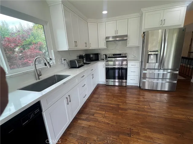 Curb Appeal! The larger and upgraded Model 4 bedrooms with 3 bathrooms Home that faces EAST located in the Sunshine Park Tract which places it above the more common single story homes nearby. Natural Bright Light pours in through the newer Double Pane windows throughout the house. It’s premium model layout includes on the main level a bright and spacious Formal Living Room with very desirable high vaulted ceilings with large front and side facing double pane windows, a Family Room has a fireplace with mantle and a pleasant view of the backyard full of fruit trees. It connects to a beautifully remodeled modern kitchen with stainless steel electric appliances: Double Door Kenmore Refrigerator with double drawers, Electric Cook top/range with built-in exhaust fan, dishwasher, portable toaster, microwave, deep sink with faucet extender. Beautiful Quartz counter top has matching back splash for easy cleaning. Modern self closing drawers with lots of additional cabinets for extra storage. The sturdy quality of the flooring made with Oak leads to the Double pane sliding door to the backyard. The kitchen area has a breakfast nook with a clear view of your backyard treasures: Fruit trees and plants composed of Pomegranate, Loquat, Kumquat, Persimmon, Dragon Fruit, Lemon, Japanese Maple tree, Japanese Wisteria Hawaiian Papaya, Avocado, Passion Fruit, Guava and the beautiful Queen of the Night Flower. Main floor bedroom downstairs with the double pane window giving a beautiful backyard view. Next to it is a main floor bathroom with a full tub which is highly desirable for guests for multi-generational living. There is an open flow between the Living Room, Dining Room and the family spaces to the exterior. The primary suite that is located upstairs has a double door entryway with a double sliding door exit to the balcony with railings. Hallway inside the primary suites leads to a his and hers sink area with a his and hers closet dressing area and a private powder room with commode and shower. The upper level also has two decent size rooms and an extra hallway bathroom with full tub. The larger than average 6,626 sq.ft. Lot makes it have a decent backyard space great for landscaping. The Sunshine Tract is known for wide streets, suburban feel and strong school zoning in the ABC School District. This was the original “Showcase” home in the tract.