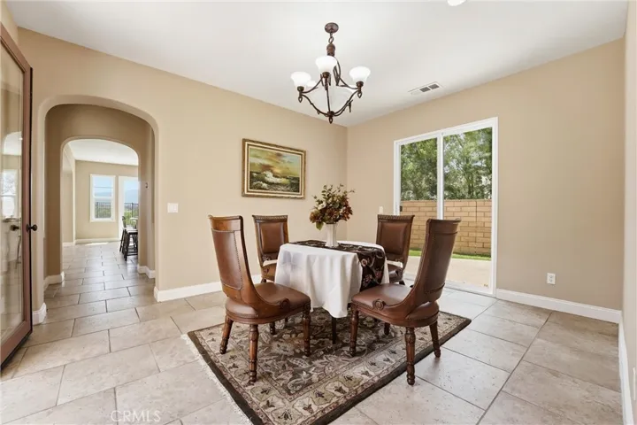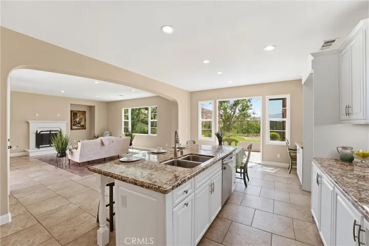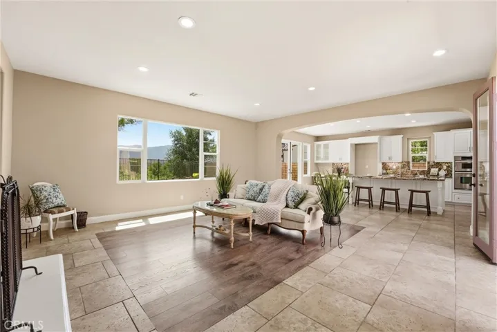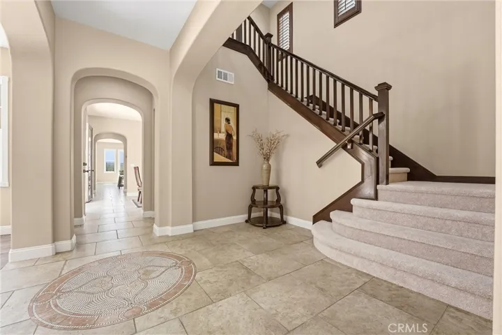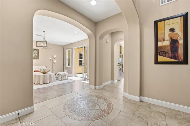 Set within the gated community of Temescal Heights at Dos Lagos, this Tuscany-style home enjoys views of the fairway, mountains, and city lights! Sitting on a large premium lot, with only one immediate adjacent neighbor, this gorgeous home is a rare find! Upon arrival, you will be delighted by the charming curb appeal: a lush garden with lovely flower beds, wrought iron accents on the front windows and doors, romantic vines draping over the walkway to the front door. The refinished wood entry door with an electronic keypad opens to a two-story-high foyer, enhanced with a marble mosaic medallion. At the center of the home, a private interior courtyard connects the surrounding rooms, including the living room, formal dining room, and the family room, and brings natural light into them. The chef’s kitchen has been updated with freshly painted white cabinetry, brand-new cabinet handles and knobs, exotic granite countertops, a full granite backsplash, under-cabinet lighting, stainless steel appliances, a center island with bar seating, and a pantry. The primary suite boasts a spacious retreat, two walk-in closets, a luxurious ensuite bath, a sparking chandelier, and views of the serene golf course, rolling hills, and city lights. Two additional secondary bedrooms upstairs are far away from the primary suite. Both enjoy spectacular sunset views and one of them has a private bath. The spacious bedroom downstairs is hidden away by the garage–just perfect for your elder parents! An optional 5 bedroom is currently used as an office, offering a view of the courtyard. A bonus room upstairs can be used as a media room, work-out gym, or a playroom etc. An oversized walk-in linen closet cleverly separates the primary suite from other living areas. A three-car tandem garage plus a individual one-car garage provide you with abundant parking and storage space. Multiple patios and oversized outdoor space make this home an entertainer’s dream! Brand new carpet on the stairs and upstairs. Upgraded stacked tile flooring and wood like vinyl flooring downstairs. Beautifully patterned tile flooring in the two baths near the secondary bedrooms upstairs. New paint gives the interior a clean and crisp look. Many new LED recess lights. Dual zoned HVAC with two Nest thermostats. Walk to Dos Lagos mall and golf course! A short drive to cinemas, markets, and restaurants. Easy access to freeway 15. Priced to sell! Don’t miss out!