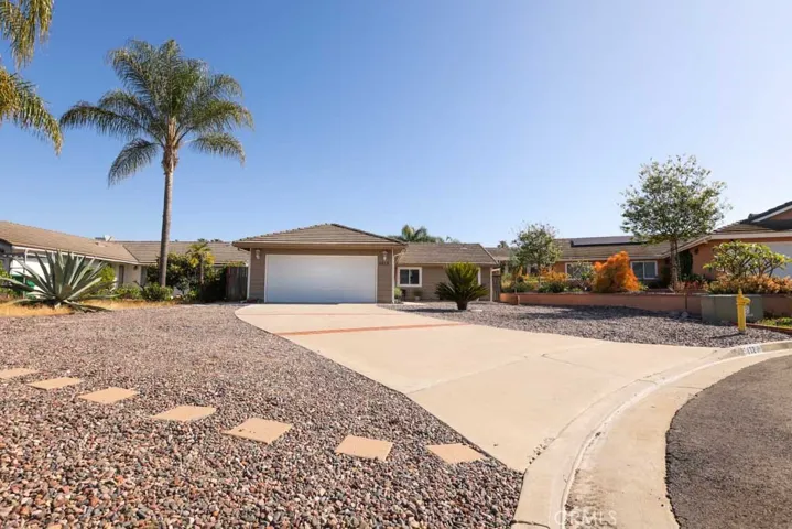 Discover effortless living in this inviting, move-in-ready single-level home tucked away on a quiet cul-de-sac. New flooring throughout. The primary suite is a true retreat, featuring vaulted ceilings and cooling breezes, with an attached newly upgraded bathroom. Also, the additional bathroom has been upgraded with new shower/tub, flooring and countertop. Ceiling fans in dining and primary suite. Entertain with ease in the family room or dining room with a cozy fireplace that flows seamlessly into the kitchen. Step outside to your newly landscaped private backyard oasis, perfect for quiet mornings or weekend hosting. Additionally the garage is equipped with overhead storage and attached cabinets for tool placement, etc., This home is located near the beautiful Guajome Park, the San Luis Rey bike trail and other beautiful local hiking trails close by and minutes to the beach. Close to freeways 5, 15, 78 and 76.