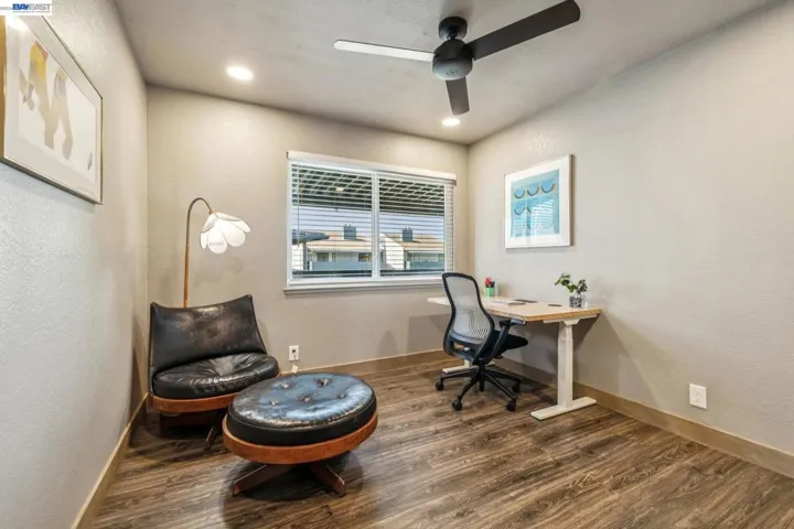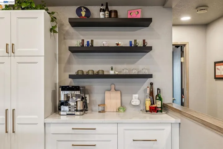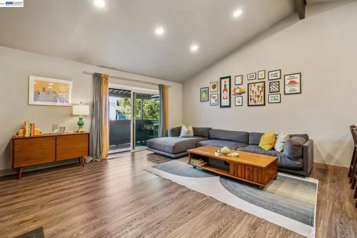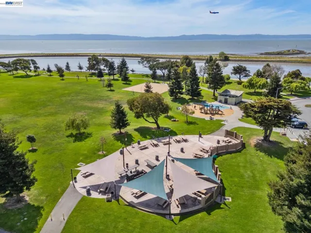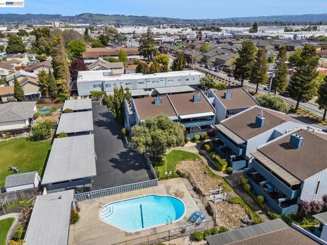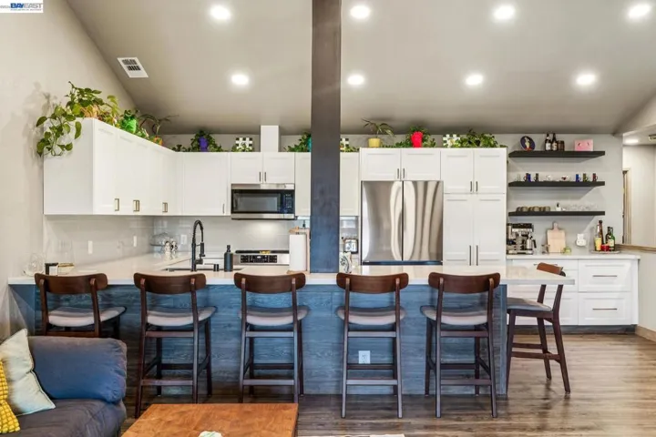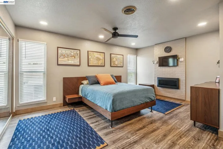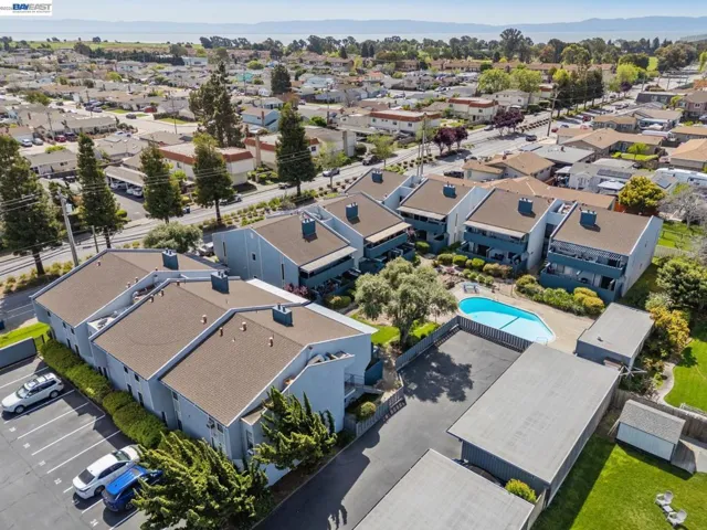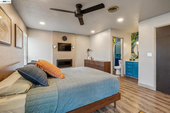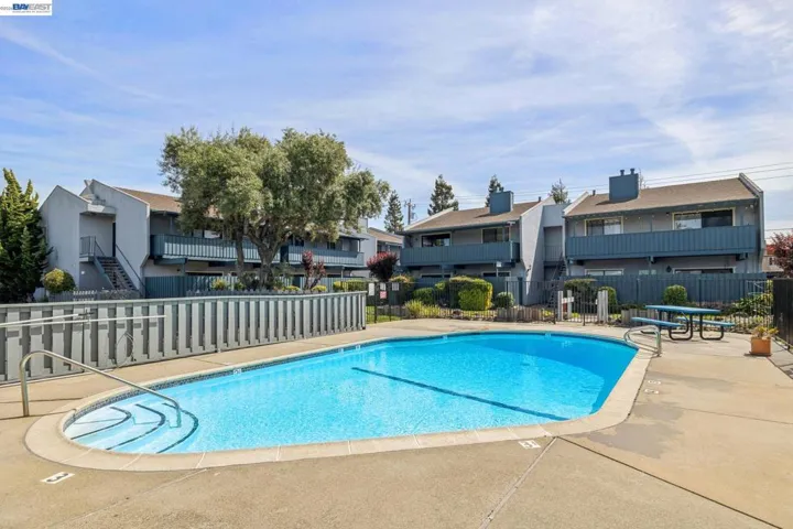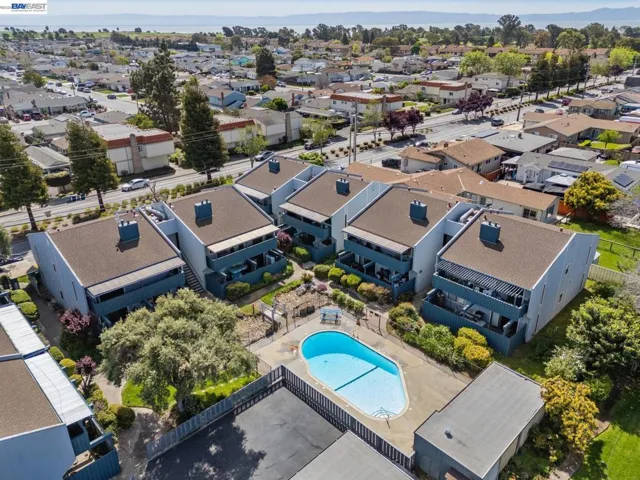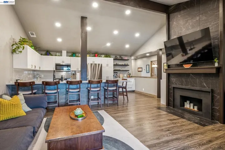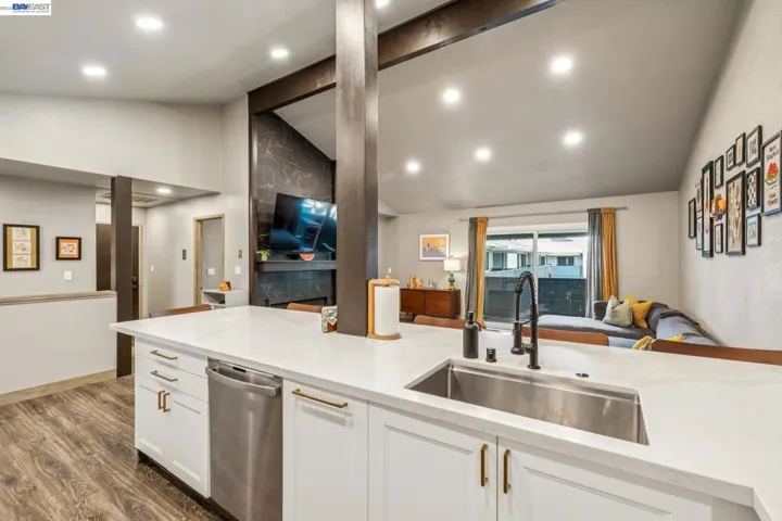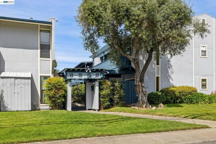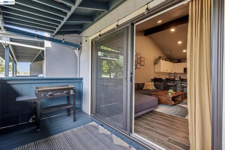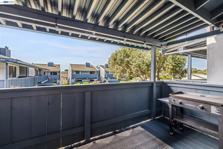 Welcome to this beautifully updated upper-level, single-story 3-bedroom, 2-bath condominium in the desirable Marina Villas community. Thoughtfully renovated, this home offers a seamless blend of comfort, style, and convenience. The permitted kitchen renovation is a standout feature, showcasing expansive countertops, a generous eat-in bar with seating for six, a dedicated coffee bar, and sleek stainless-steel appliances—ideal for both everyday living and entertaining. The adjacent living room impresses with vaulted ceilings, a dramatic tiled accent wall with decorative fireplace, and a sliding glass door that opens to a full-length private balcony. Enjoy tranquil views overlooking the community’s lush gardens and pool area—perfect for morning coffee or evening relaxation.The hall bathroom features a shower-over-tub combination, enhanced by eye-catching mid-century inspired wallpaper, along with a conveniently located stackable washer and dryer. The spacious primary suite offers a wall-length mirrored closet with built-in organization, along with a cozy electric fireplace and mounted TV. The ensuite split bath includes a shower stall and is beautifully finished with vibrant tropical wallpaper, creating a serene retreat. The generously sized second bedroom features a wall-length closet and windows overlooking the rear of the unit, offering a quiet and comfortable space for guests or additional living needs. A versatile third bedroom—currently used as a home office—enjoys peaceful views of the landscaped grounds and mature trees, providing an inspiring work-from-home environment. Additional highlights include two deeded parking spaces: the covered one includes a generously sized storage closet. Ideally located near shopping, dining, and outdoor recreation, including nearby golf courses and waterfront amenities. Commuters will appreciate easy access to I-880 and proximity to Oakland International Airport.