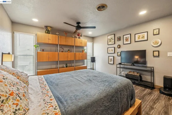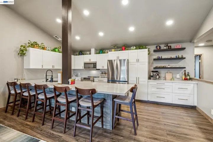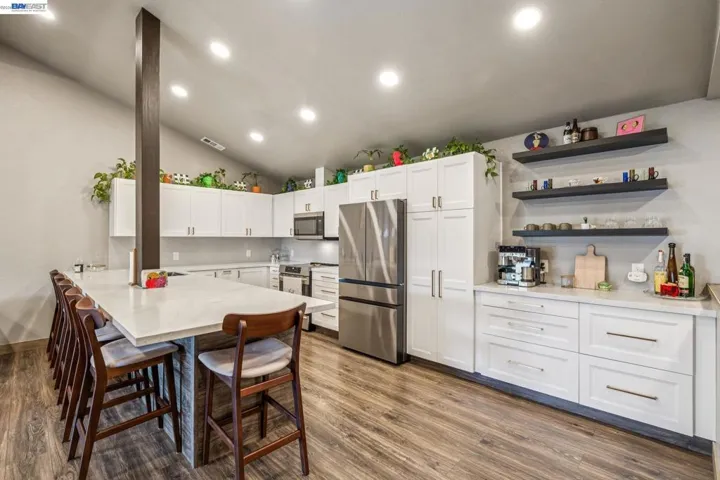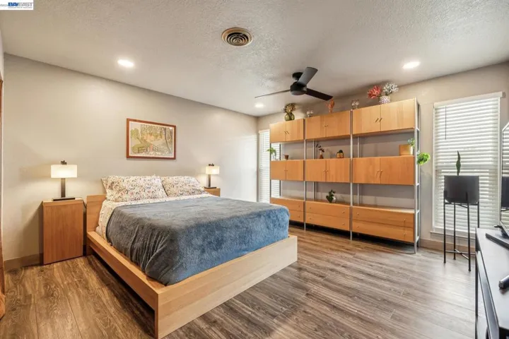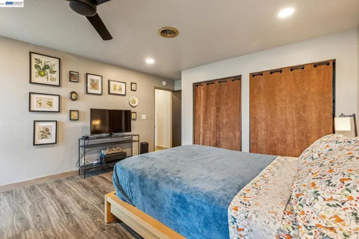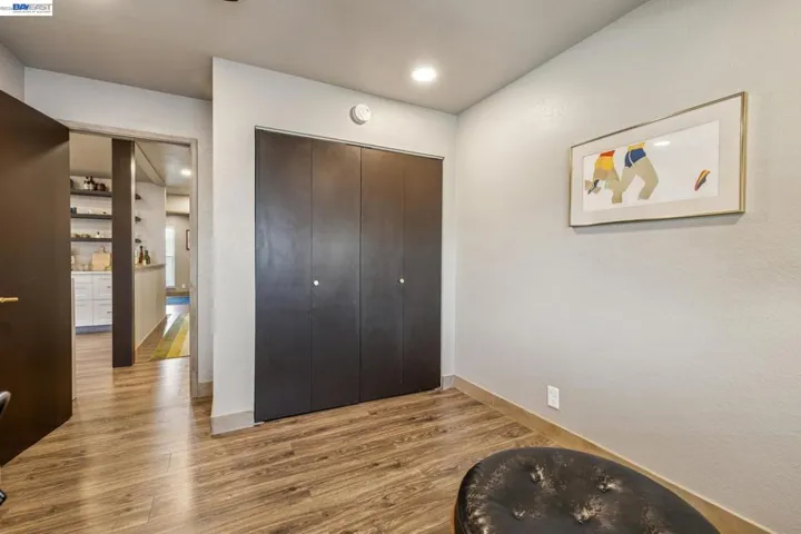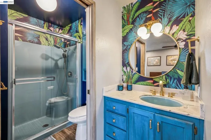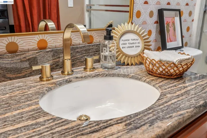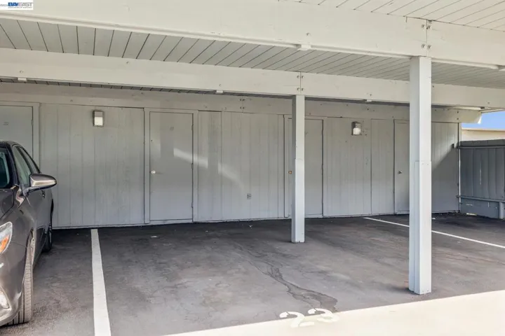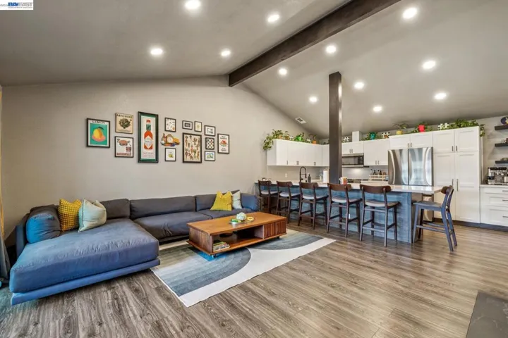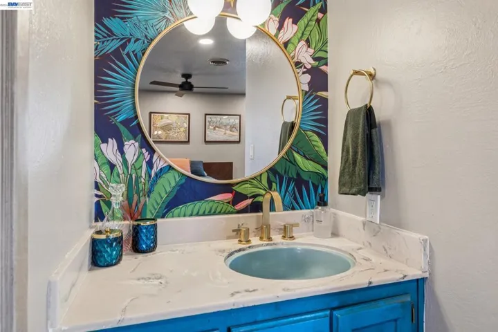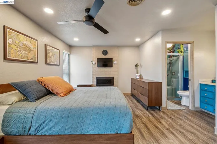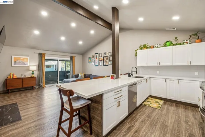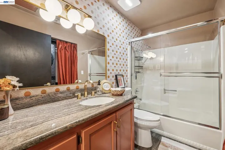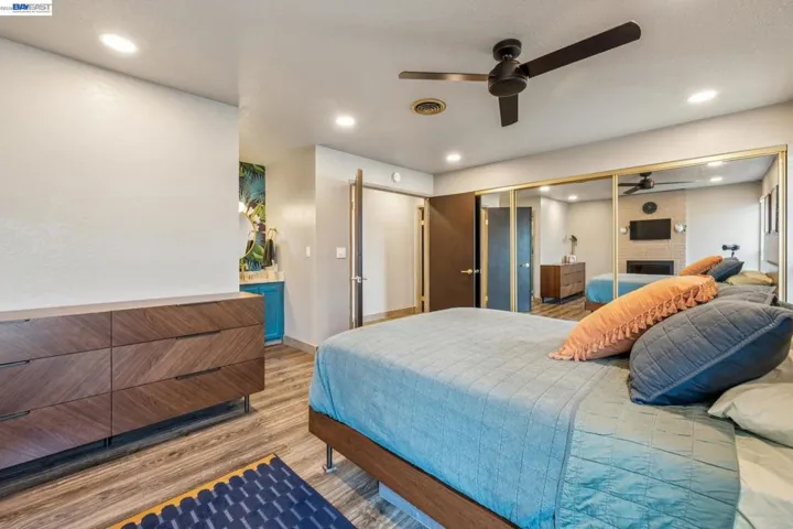 Welcome to this beautifully updated upper-level, single-story 3-bedroom, 2-bath condominium in the desirable Marina Villas community. Thoughtfully renovated, this home offers a seamless blend of comfort, style, and convenience. The permitted kitchen renovation is a standout feature, showcasing expansive countertops, a generous eat-in bar with seating for six, a dedicated coffee bar, and sleek stainless-steel appliances—ideal for both everyday living and entertaining. The adjacent living room impresses with vaulted ceilings, a dramatic tiled accent wall with decorative fireplace, and a sliding glass door that opens to a full-length private balcony. Enjoy tranquil views overlooking the community’s lush gardens and pool area—perfect for morning coffee or evening relaxation.The hall bathroom features a shower-over-tub combination, enhanced by eye-catching mid-century inspired wallpaper, along with a conveniently located stackable washer and dryer. The spacious primary suite offers a wall-length mirrored closet with built-in organization, along with a cozy electric fireplace and mounted TV. The ensuite split bath includes a shower stall and is beautifully finished with vibrant tropical wallpaper, creating a serene retreat. The generously sized second bedroom features a wall-length closet and windows overlooking the rear of the unit, offering a quiet and comfortable space for guests or additional living needs. A versatile third bedroom—currently used as a home office—enjoys peaceful views of the landscaped grounds and mature trees, providing an inspiring work-from-home environment. Additional highlights include two deeded parking spaces: the covered one includes a generously sized storage closet. Ideally located near shopping, dining, and outdoor recreation, including nearby golf courses and waterfront amenities. Commuters will appreciate easy access to I-880 and proximity to Oakland International Airport.
