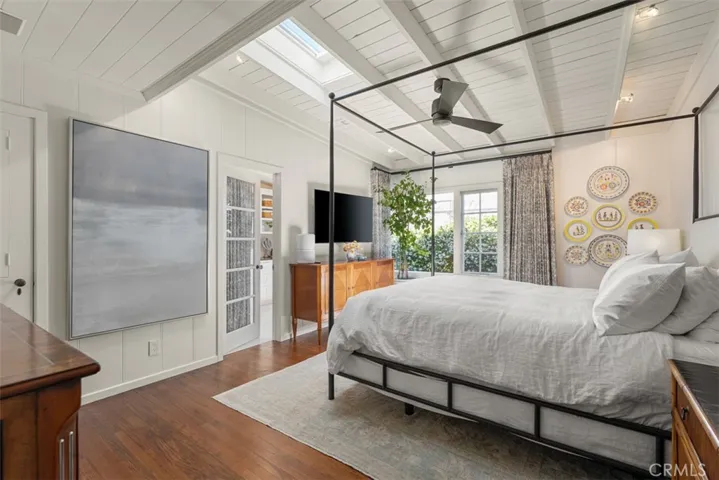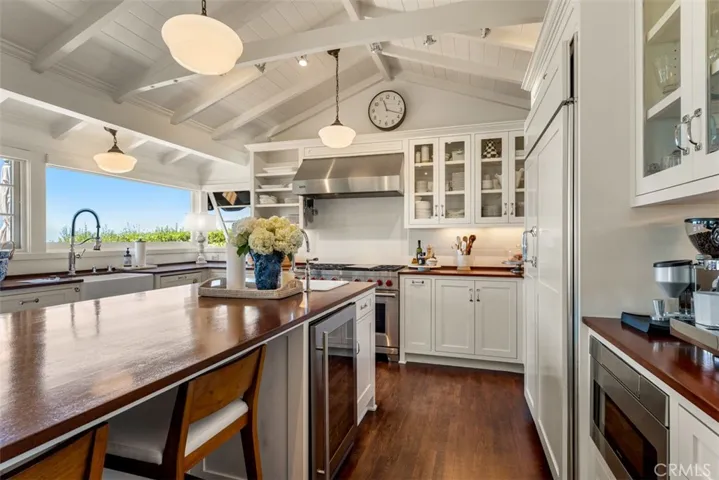Distinctive architectural details include vaulted beam ceilings, rich hardwood flooring, skylights, and a cozy wood-burning fireplace. Built-in speakers and air conditioning enhance comfort throughout. At the heart of the home, a beautifully appointed chef’s kitchen showcases a mahogany island with seating for four, a U-Line wine refrigerator, Viking Professional range, Sub-Zero refrigerator, and Bosch dishwasher, all finished with custom panels and hardware for a refined, cohesive aesthetic.