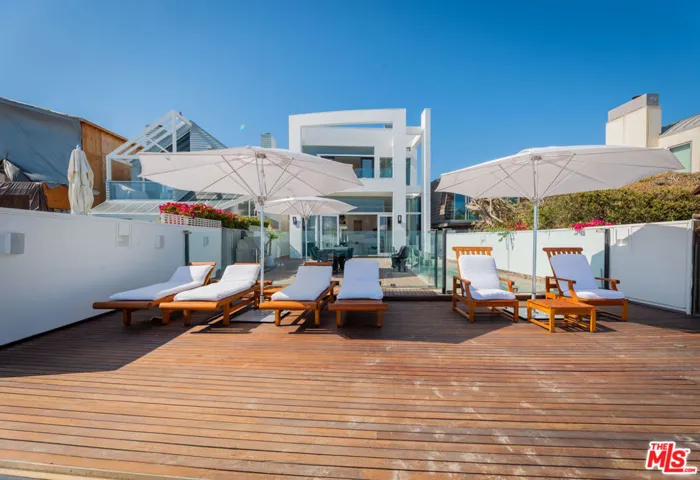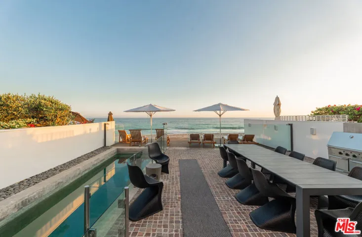 Located on the deepest part of sandy Malibu Colony beach, this stunning, newly remodeled architectural residence evokes the essence of Malibu beach sophistication. Gated for privacy, one enters into a fully landscaped courtyard where they are greeted by a modern water feature which leads to a large glass and beam enclosed entry. The impeccably furnished dining and living areas are as inviting as they are inspiring with soaring ceilings, recessed cove lighting, retractable buffets, significant art walls, contemporary fireplace and an ocean side wall of glass. Show off your culinary skills in style while watching the waves break in this newly completed entertainer’s kitchen, which showcases gorgeous stone finishes, Miele appliances and touch-open cabinetry for that extra touch of class. The comfortable den includes a chic gallery wall of photography and display shelves for your collections. A private stairway takes you past the office alcove to the ocean view master suite and bath equipped with a glass privacy partition, skylights that allow you to star gaze from the bed, as well as a sitting area and oceanfront patio. There are three additional en-suite bedrooms and a detached studio perfect for live-in staff or visiting friends. There is an internal courtyard opposite the entry for casual conversation over a fire pit. The spacious beachfront patio with pool, spa, lounging and dining areas is the dream location for entertaining friends or a peaceful retreat for relaxing. The height of luxury in the heart of Malibu’s ‘Gold Coast’ awaits! Call for annual pricing.
